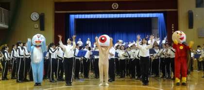 中央体育館での練習後、八幡屋小学校講堂でマーチング練習をする様子を見せていただきました。キッズバンドの児童・保護者やいきいき教室の児童は、大人数のマーチングの迫力ある演奏や動きを真剣に見つめていました。また、後半は子どもの踊れる曲やぬいぐるみも出てきて子どもたちは大喜びでした。