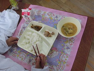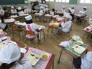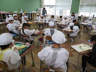 一年生は、本年度いっぱいで転校するお友だちとのお別れ会の流れでいつもと違う形での一年生最後の給食となりました。