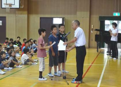 下段:夏休みの水泳記録会の記録証の授与。今年は、サッカー・バドミントンのスポーツ交流会にも参加しました。