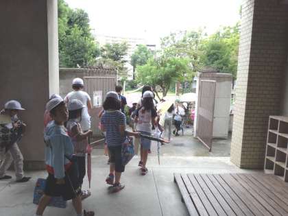 台風が近づいてきたという想定で、講堂に集まり、地区ごとに分かれて集団下校をしました。