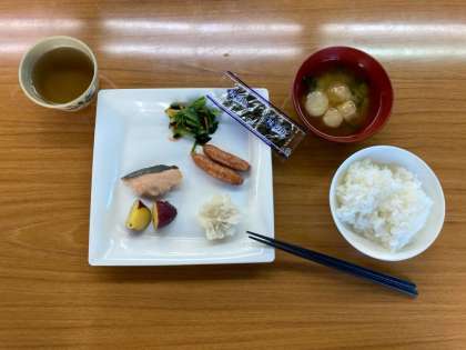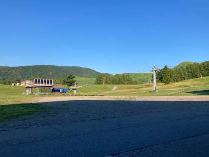 そして、二日目の朝。ハチ高原の朝は清々しいです。朝のつどいは宿舎前で行いました。これから朝ごはんをいただきます。