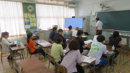 校内の研修がありました。算数の授業を職員が児童役となり、みんなで取り組みました。難しい問題だったので、グループになり、みんなで助け合いながら。問題にチャレンジしました。