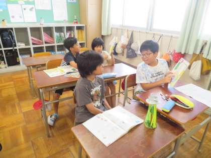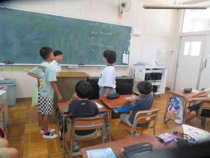 外国語学習では1学期の振り返りを行いました。好きな食べ物やスポーツを訪ねあったり、曜日クイズを出し合ったりして学習しました。