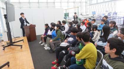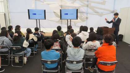 写真は空飛ぶクルマについてのお話の様子です。子どもたちはすぐそこにある未来の乗り物についてのお話を真剣に聞いていました。