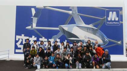 最後にみんなで記念写真を撮影して帰りました。今回は、大阪メトロ空飛ぶクルマ推進室の方々、貴重な体験を子どもたちにさせていただき、ありがとうございました。