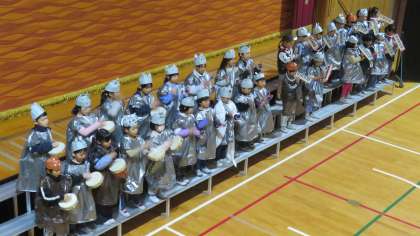 2年生の『ニャーゴ 合唱・合奏』の様子です。子どもたちの「かぶりもの」がカワイイですね。