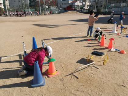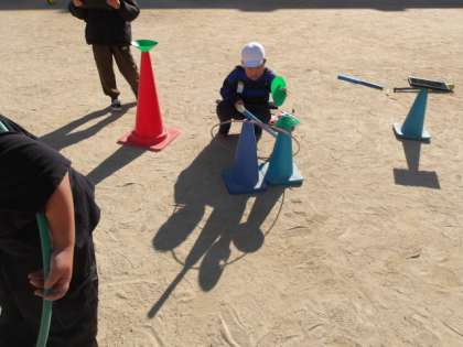 図画工作科で「光とかげから生まれる形」を学習しました。児童は思い思いに体育倉庫の用具を組み合わせて個性的な形を撮影しました。