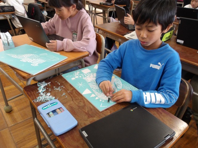 図工科では、自分で書いたイラストに様々な模様を彫刻刀の特徴を活かして掘ることができました。