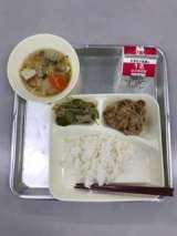 冬野菜のカレーライス ブロッコリーとコーンのサラダ 黄桃 牛乳