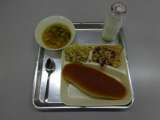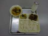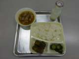 今日の給食はプルコギ・とうふのスープ・チンゲンサイともやしの甘酢あえ・米飯・牛...