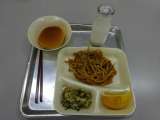 今日の給食はきびなごのてんぷら・みそ汁・えんどうの卵とじ・米飯・牛乳です。学校で...
