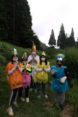 キャンプファイヤーです。火の神から、希望、団結、平和、友情の火をもらったあと、5...