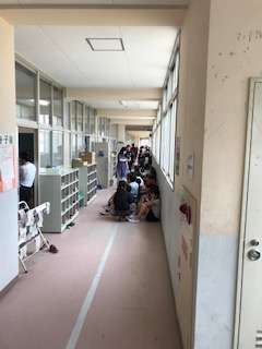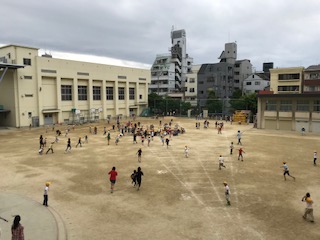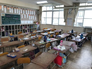休み時間に地震が起きた事を想定して、それぞれの場所で身を守る行動を取った後、揺れが収まったことを想定して一旦に運動場に避難しました。