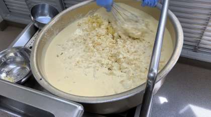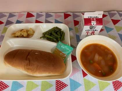 今日の献立は、ケチャップ煮・三度豆のソテー・りんごのクラフティ・コッペパン・りんごジャム・牛乳でした。「りんごのクラフティ」は、フランスの郷土菓子をアレンジしたものです。給食ではコーンフレークの上にりんごを混ぜた生地を流しいれて焼いています。