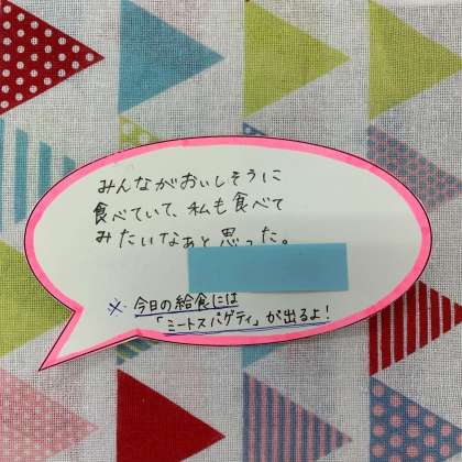 今日は「スパゲッティミートソース」にちなんで、「もりのスパゲッティやさん」を紹介しました。食を通して図書に親しむ機会になればと思います。