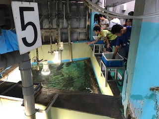 マンボウの泳ぐ水族館志摩マリンランドで回遊水槽の上から魚に餌をあげる体験とフンボルトペンギンにタッチする体験をしました。