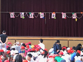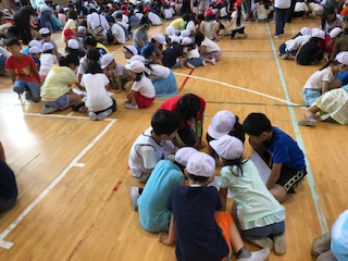 今朝の児童集会は、金曜日のなみよけまつりに向けた各グループの話し合いです。