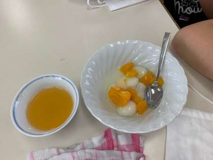 トッピングはそれぞれの班の希望のもの、フルーツやきな粉、ジュース等で用意しました。「おいしい〜!」という声をたくさん聞くことができました。