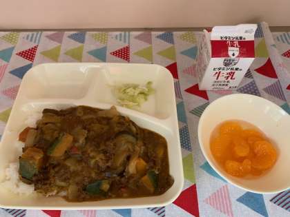 今日の献立は、夏野菜カレー・キャベツのサラダ・みかん(缶)・牛乳でした。
