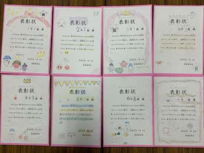 右の写真は、もりもりんぴっくの表彰状です。たくさんのクラスが協力して入賞することができました。表彰状は給食委員会の子の手作りです。