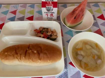 今日の献立は、鶏肉と夏野菜のソテー・押し麦のスープ・すいか・おさつパン・牛乳でした。
