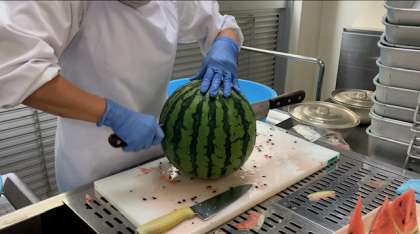 「すいか」も年に1度の登場です!1玉を64等分に切り分けて配缶します。「甘くておいしい〜!」や「この種植えたらすいかできるかな?」など楽しい声を聞くことができました。