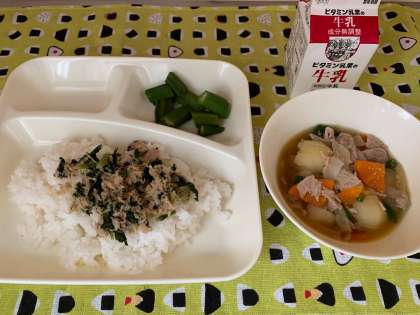 1学期最後の給食の献立は、豚肉とじゃがいもの煮もの・オクラの甘酢あえ・ツナっ葉いため・ごはん・牛乳でした。ツナっ葉いためはごはんがよくすすむふりかけで、児童にとても好評でした。