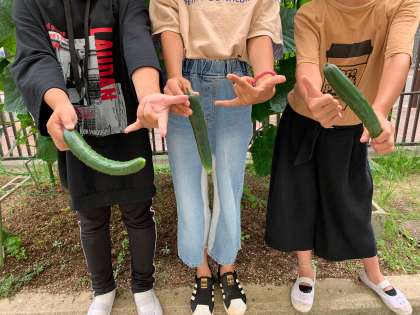 給食委員会で育てていたきゅうり、立派に成長し収穫できました。1人1本ずつ持って帰ることができました。一生懸命育てたきゅうりの味はどうかな?感想を聞くのが楽しみです。