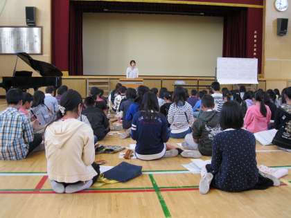 5年生は、2時間目に体育館で3クラス合同音楽をしていました。リコーダーの演奏と歌を中心に学習していました。