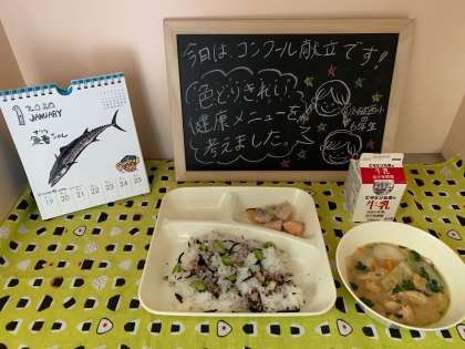 この献立は、平成30年度学校給食献立コンクール最優秀賞作品をもとにした献立です。児童が考えた献立のねらいは、「いろどりを意識して、見た目も味も食感も楽しんでもらう健康メニューを考えました。」となっています。
