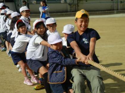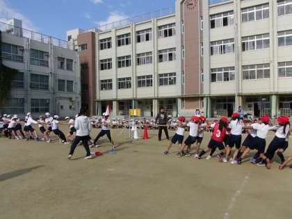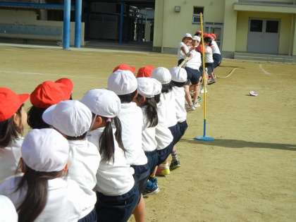 肌寒くなった校庭に元気な声が響き渡りました。児童会行事の1年生と6年生のなかよし集会が行われました。内容は、綱引き。赤白に分かれて、同学年対決、混合チーム対決で楽しみました。そして、最後にサプライズ対戦。6年生VS1年生。6年生は、学級の力自慢10名、1年生は、1クラス全員です。結果は・・・。みんなで仲良く楽しいひと時を過ごすことができました。リーダーの子たちの活躍も光っていましたが、周りの子の盛り上げ上手ぶりも輝いていました。