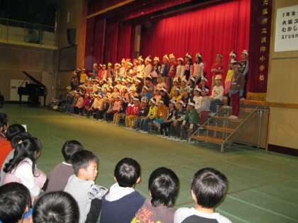 昔話を題材にしたクイズ形式の呼びかけや群読、合奏、歌を発表しました。長い長い話をしっかりと覚えて一生懸命に発表していました。