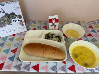 今日の給食は、かぼちゃのクリームシチュー・ミックス海そうのサラダ・りんご(カット缶)・黒糖パン・牛乳でした。