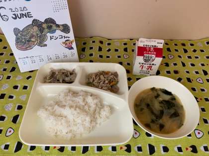 今日の給食は、豚肉と野菜のいためもの、みそ汁、キャベツの赤じそあえ、ごはん、牛乳でした。