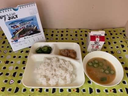 今日の給食は、鶏肉のしょうゆバター焼き、みそ汁、きゅうりのあえもの、ごはん、牛乳でした。