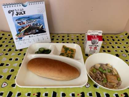 今日の給食は、豚肉と野菜の煮もの、チヂミ、きゅうりの甘酢あえ、黒糖パン、牛乳でした。