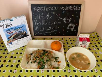 今日は、令和元年度学校給食献立コンクール最優秀賞に選ばれた献立です。献立のねらいは「疲労回復と夏バテ防止をメインに考えました」です。