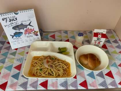 スパゲッティには、夏が旬のトマトを使用しています。今日は、生のトマトを使用し夏らしい味わいに仕上がりました。子どもたちにもとても好評な献立でした。