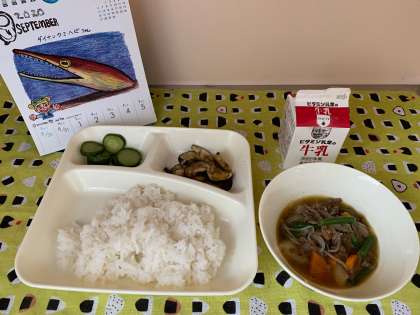 今日の給食は、肉じゃが、焼きなすのみそだれかけ、あっさりきゅうり、ごはん、牛乳でした。