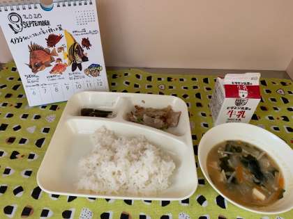 今日の給食は、豚肉の甘辛焼き、みそ汁、オクラのおかかいため、ごはん、牛乳でした。