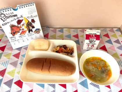 今日の給食は、鶏肉とてぼ豆のスープ煮、じゃがいもとトマトのチーズ焼き、なし(二十世紀)、黒糖パン、牛乳でした。