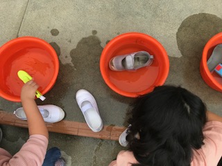 1年生は生活科の学習で上靴洗いをしていました。これからは、自分でできるかな?