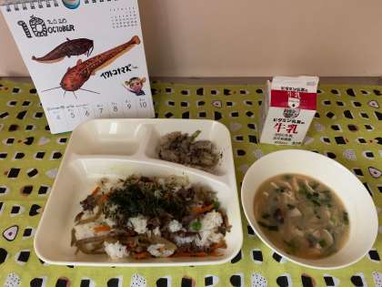 今日の給食は、牛肉のきんぴらちらし、みそ汁、キャベツの赤じそあえ、牛乳でした。