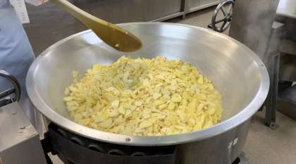 スイートポテトは、手作りのデザートです。さつまいもが煮崩れるまでしっかり煮てから、つぶして焼き物機で焼いています。