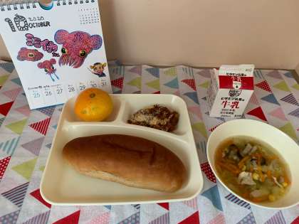 今日の給食は、なすのミートグラタン、鶏肉と野菜のスープ、みかん、黒糖パン、牛乳でした。