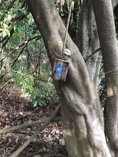 文字を書いた板は木に紛れてなかなか見つけられません。