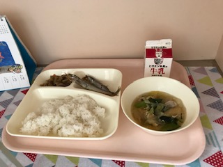 今日の給食は焼きししゃも、五目汁、きんぴらごぼう、ごはん、牛乳でした。