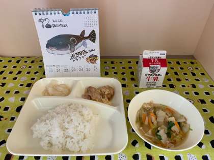 今日の給食は、鶏肉のしょうゆマヨネーズ焼き、五目汁、かぶのゆず風味、ごはん、牛乳でした。