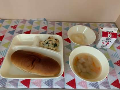 今日の給食は、ほたて貝のグラタン、スープ、和なし(カット缶)、黒糖パン、牛乳でした。
