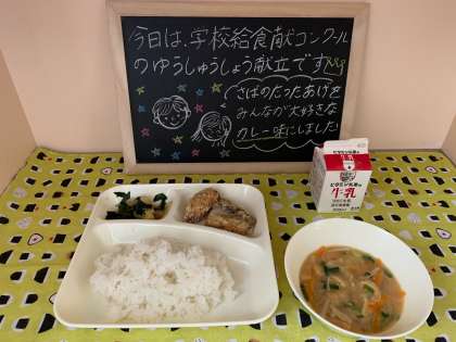 今日の給食は、さばのカレーたつたあげ、さつまいもとうすあげのみそ汁、はくさいとほうれんそうの煮びたし、ご飯、牛乳でした。
